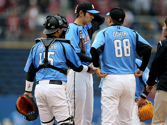 投手 福山 ピッチャー福山に代わってクルーズがマウンドにあがる 牧田がライトの守備につく |