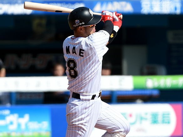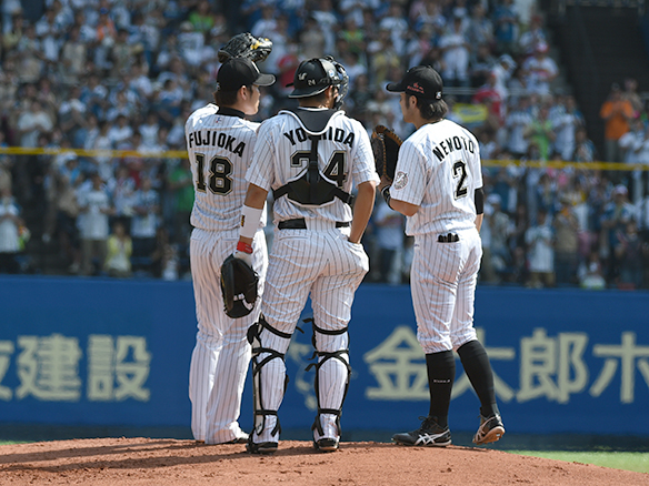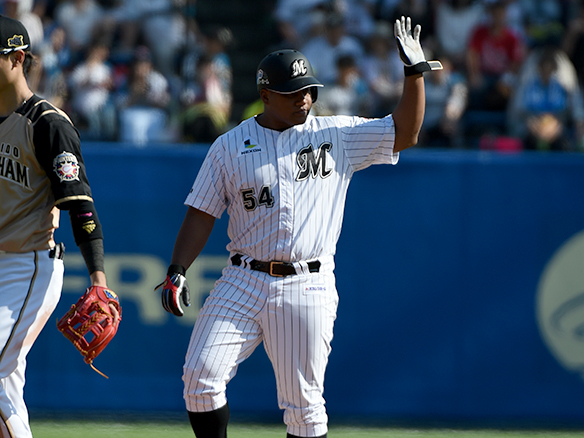 7番 レアード 四球 一度もバットを振ることなくフォアボールを選ぶ 1,2塁 |
