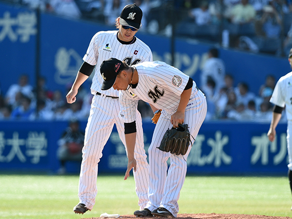 ピッチャー瀬川に代わって屋宜がマウンドにあがる |