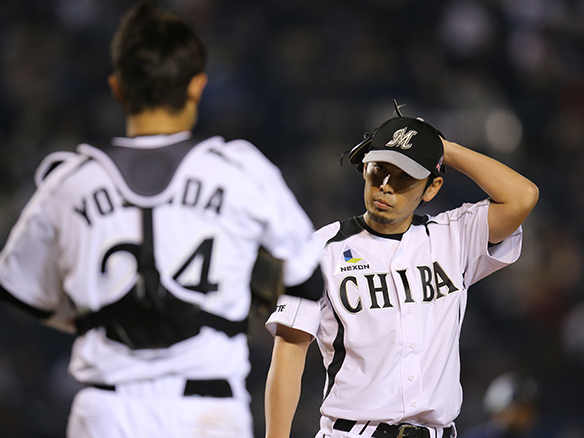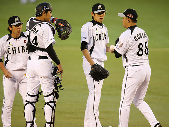 投手 金森 ピッチャー金森に代わって香月良がマウンドにあがる 荻野貴がレフトの守備につく 守備変更:角中レフト→ライト |