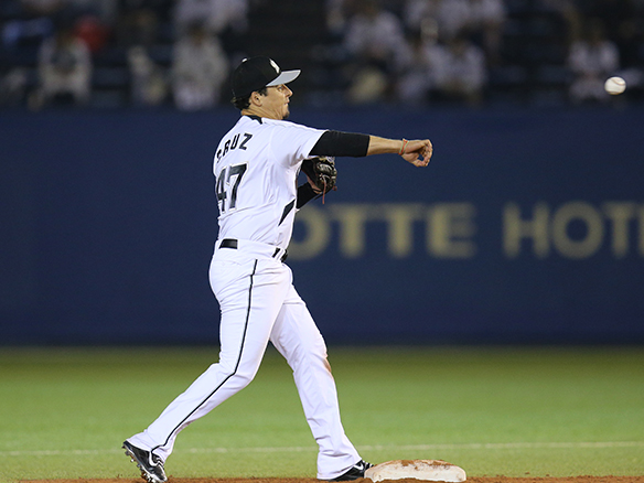 セカンド・クルーズが1塁へ転送し併殺を完成!