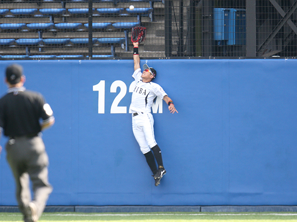 守備の名手・岡田がフェンス際の打球をジャンピングキャッチ!!
