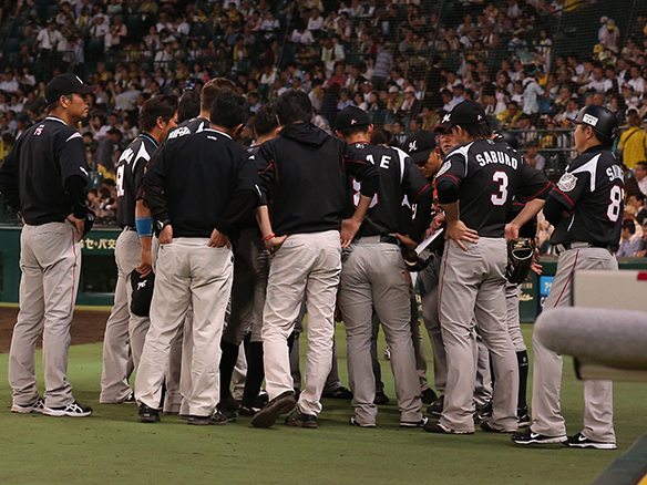6番 今成 四球 一度もバットを振ることなくフォアボールを選ぶ 1塁 |