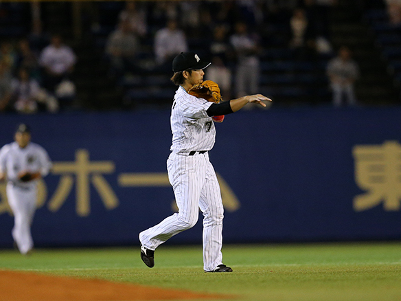 代打・岡田は自慢の足を飛ばすが惜しくも出塁ならず
