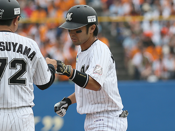 5番 福浦 右中二 1アウト1,2塁の1-0からライトへタイムリーツーベース! ロ1-2巨 2,3塁 ![]() 1