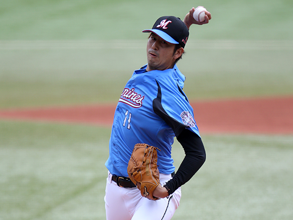 3番 縞田 四球 外角の落ちる球を見送りフォアボール。ロッテ、満塁のピンチをまねく 満塁 |