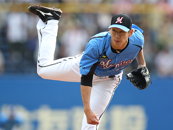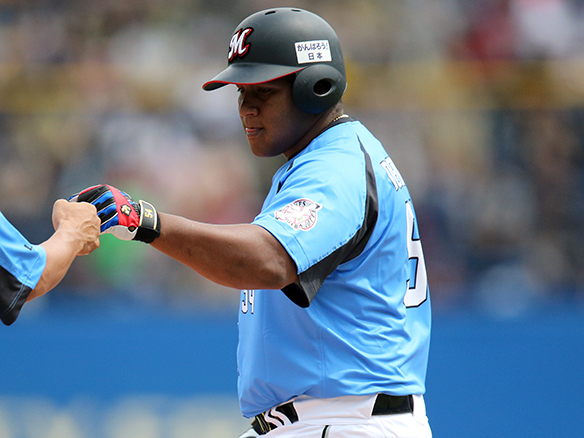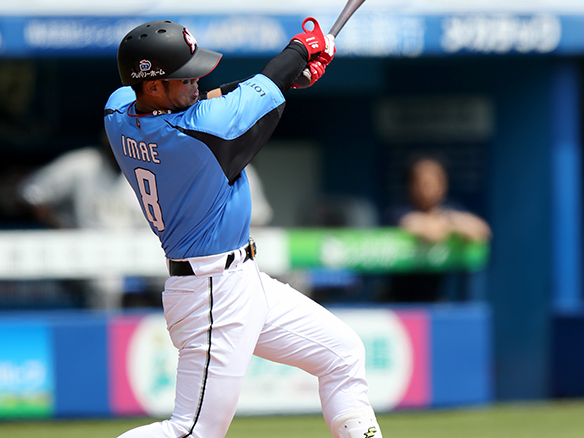 投手 大嶺祐 6番 カラバイヨ 空三振 外角のスプリットに空振り三振でバッターアウト 1アウト |