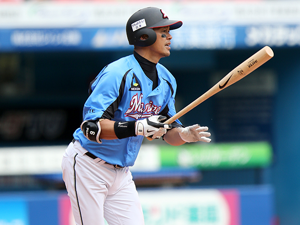 9番 ブランコ 左越安 レフトへのヒットを放つ 1塁 |
