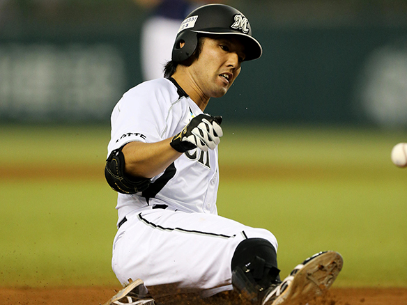 3番 角中 中犠飛 ランナーフルベースの2-2からセンターへの犠牲フライを放つ 西3-2ロ 1アウト1,2塁 ![]() 3