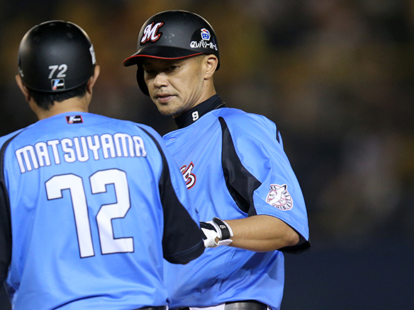 代打・福浦は安打で出塁し、コーチとグータッチを交わす