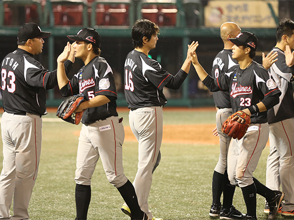 プロ通算100勝を達成した涌井が勝利のハイタッチ!!
