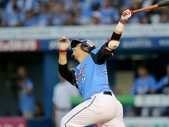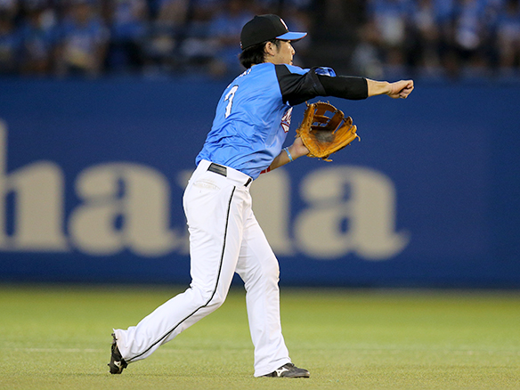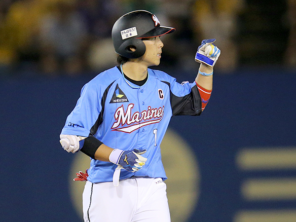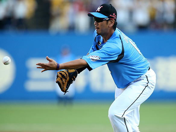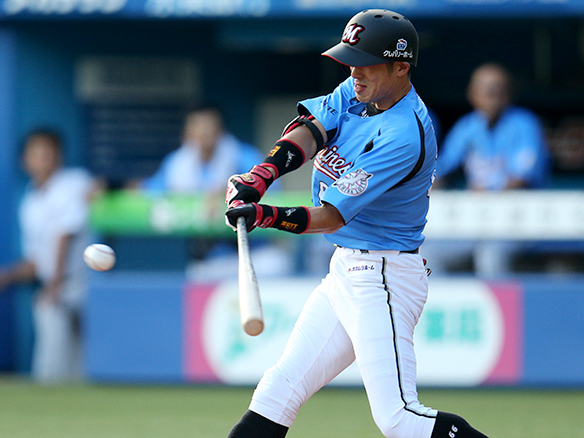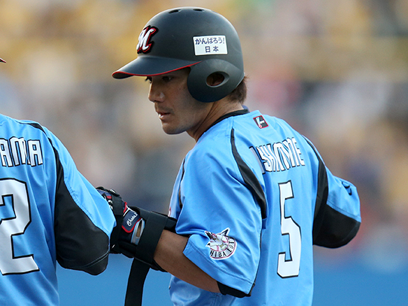 投手 大嶺祐 1番 明石 左安 レフトへのヒットで出塁 1塁 |