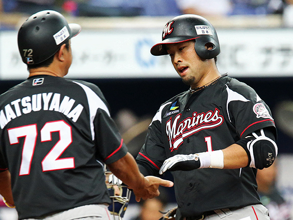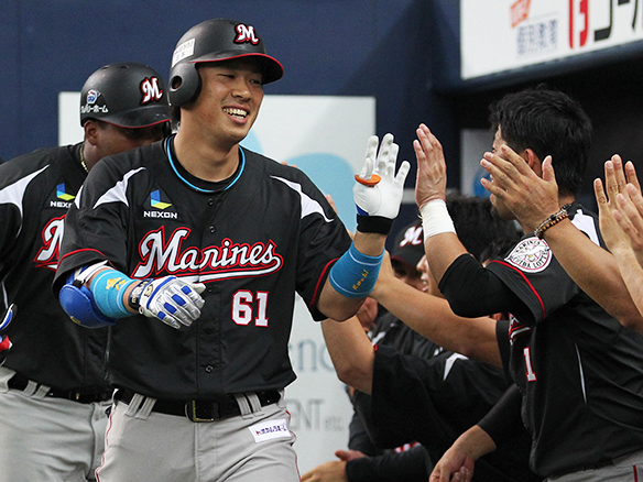 2ランを放った角中が、ベンチにタッチで迎えられる!
