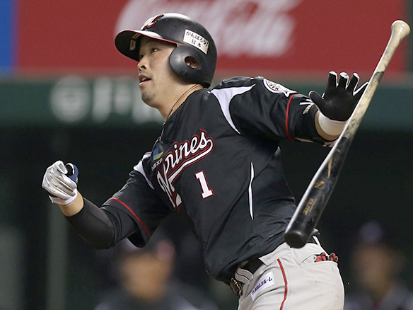 投手 郭俊麟 4番 デスパイネ 四球 150キロのストレートを見送り四球を選ぶ 1塁 |