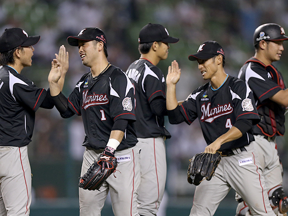 勝利して、ハイタッチを交わすマリーンズナイン!!