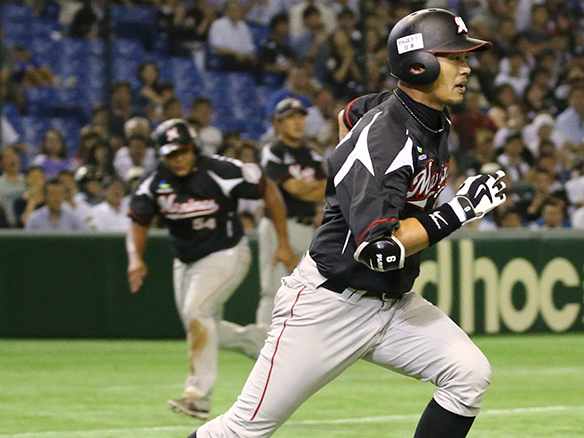 2番 角中 左安 レフトへのヒットで出塁 1塁 |
