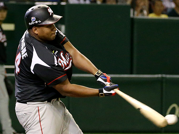 4番 デスパイネ 左中二 フェンス直撃のツーベースを放つ 2塁 |