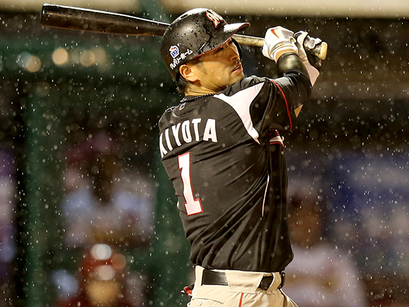 5番 銀次 左安 ランナー1,2塁からレフトへのヒットを放つ 満塁 |