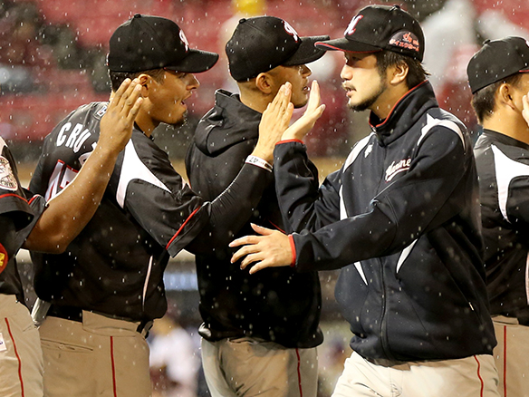 10勝目を挙げ勝利のハイタッチを交わす石川