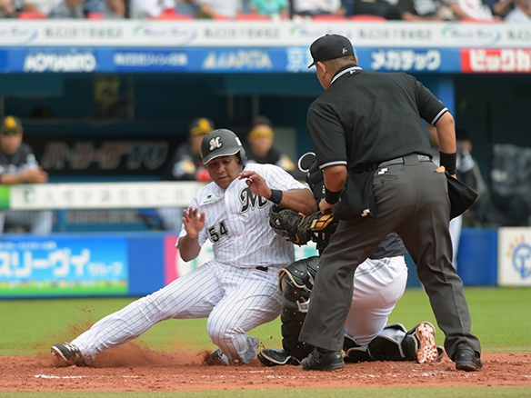 デスパイネが本塁を狙うが惜しくもアウトとなる