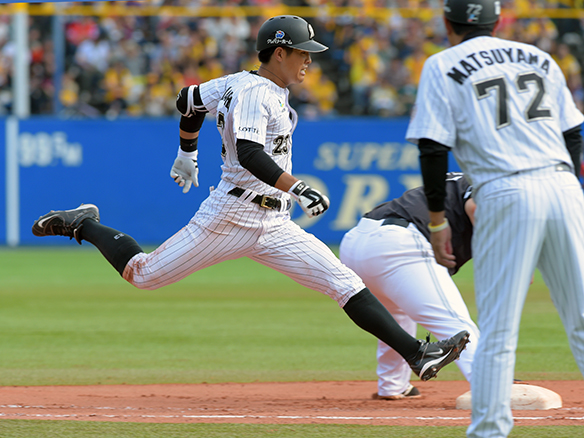 8番 今宮 中安 センターへのヒットを放つ 1塁 |