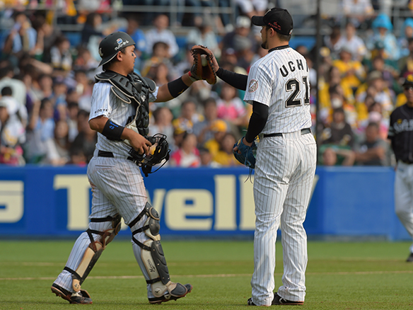 1番 荻野貴 四球 内角のスライダーを見送りフォアボールを選ぶ 1,2塁 |