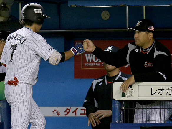 同点の犠飛を放ち、監督とグータッチを交わす鈴木