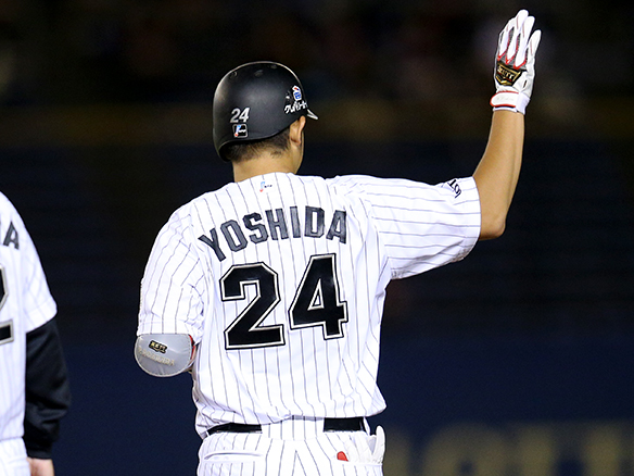 先頭の吉田がヒットで出塁しファンの声援に応える