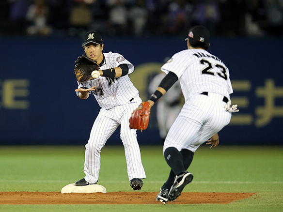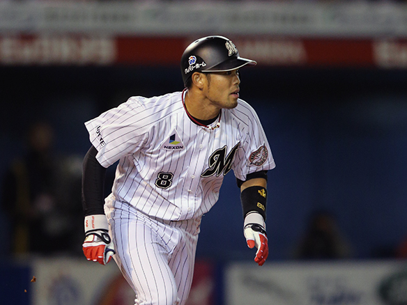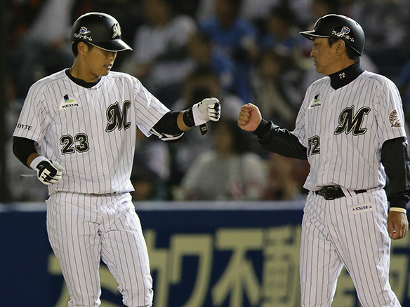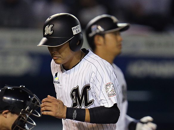 8番 岡田 一バ安 1アウト3塁の2-0からファーストへのタイムリー内野安打でロッテ勝ち越し! ロ2-1日 1塁 ![]() 1