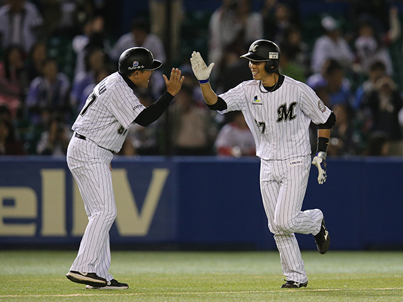 三木がプロ入り初本塁打を放ち笑顔でハイタッチ!