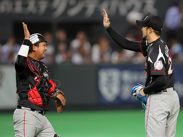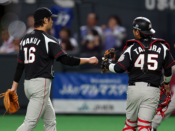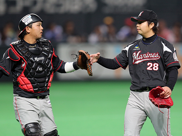 無死満塁のピンチを切り抜けタッチを交わすバッテリー!!