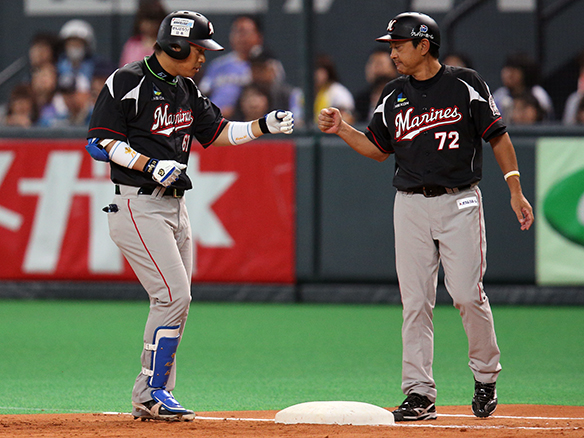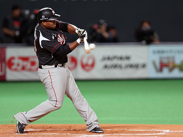 6番 レアード 右安 ライトへのヒットを放つ 1,3塁 |