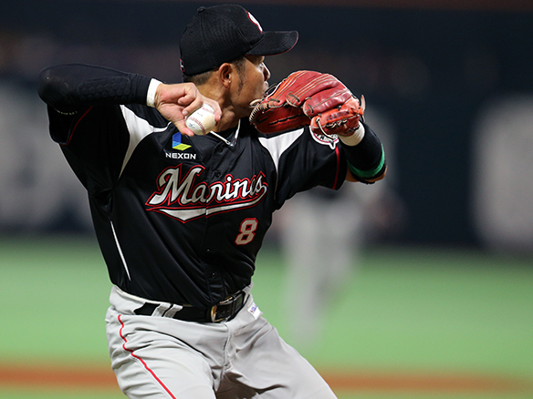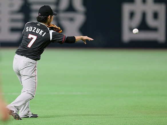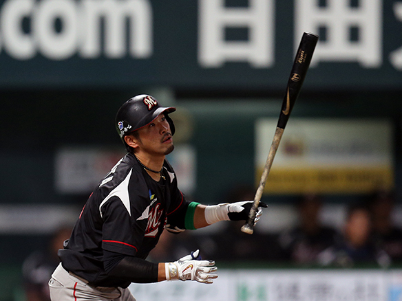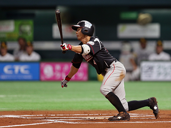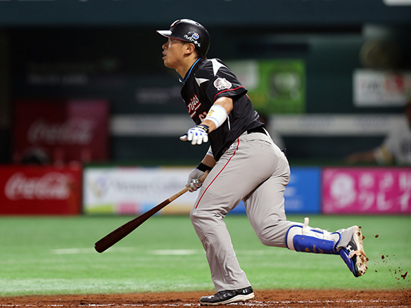 投手 大嶺祐 1番 明石 左安 レフトへのヒットを放つ 1塁 |