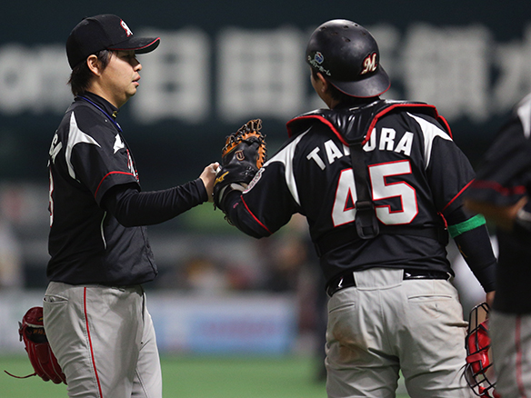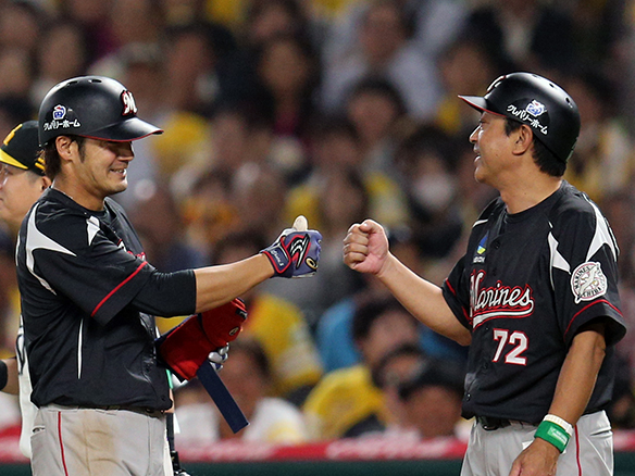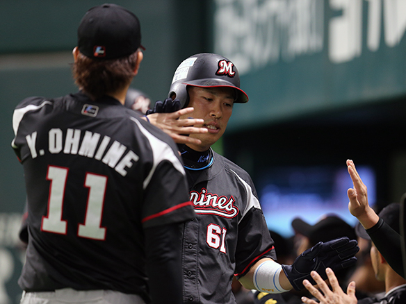 清田の適時二塁打で先制し生還した角中がタッチを交わす!!