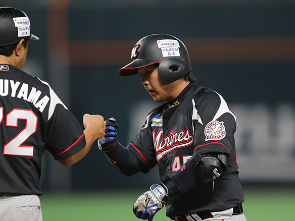 田村の同点適時打で生還した鈴木がベンチでタッチを交わす!!