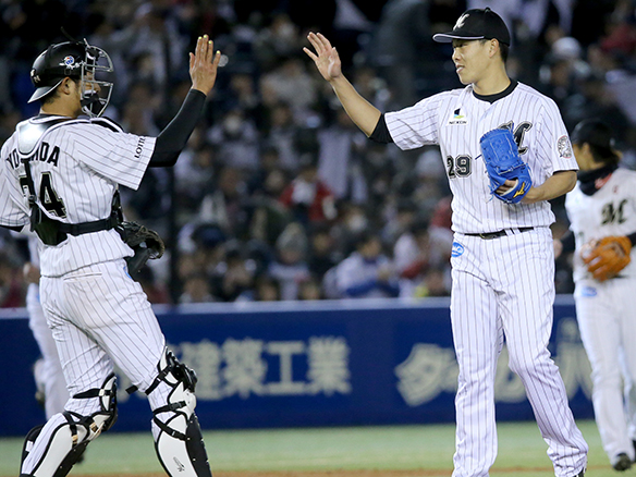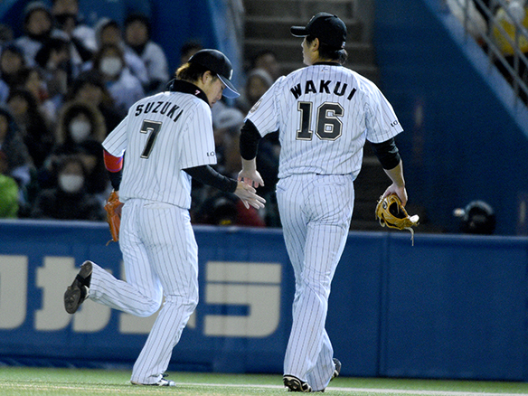 7回を無失点で投げ切り、鈴木とタッチを交わす涌井