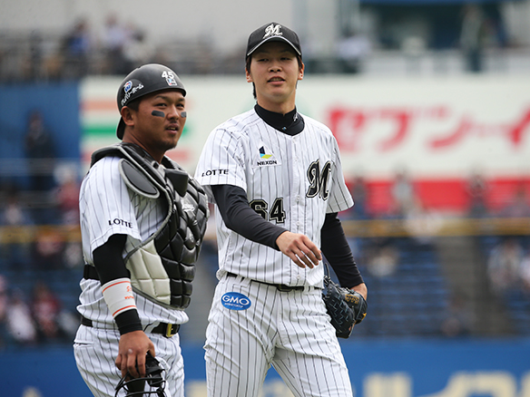 プロ初先発・二木は無失点で終え田村とともにベンチへ戻る