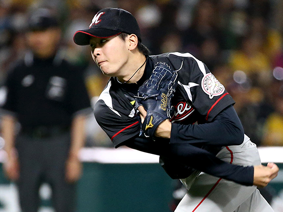 投手 二木 9番 斐紹 空三振 空振りの三振を喫する 1アウト |