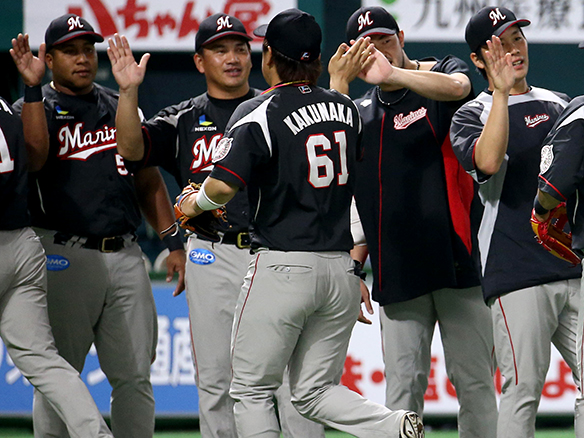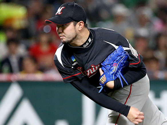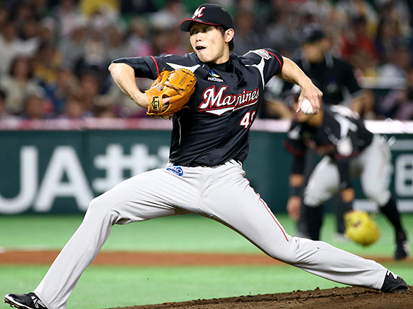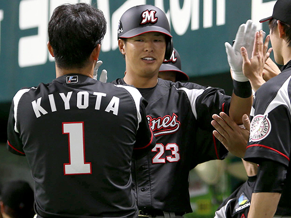 2番 今宮 四球 外角の真っ直ぐを見送りフォアボール。ロッテ、満塁のピンチをまねく 満塁 |