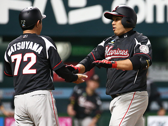 5番 清田 左本 2アウト2塁の2-1からレフトスタンドへの2ランホームランでロッテ同点! ソ2-2ロ ![]() 2