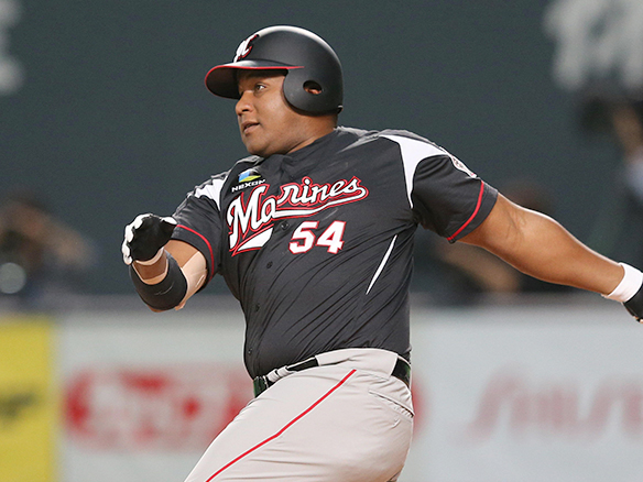 6番 レアード 中犠飛 ランナーフルベースの1-2からセンターへの犠牲フライを放つ 日2-0ロ 2アウト1,3塁 ![]() 2