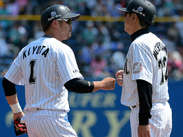 8番 レアード 右邪飛 ファウルフライを清田(右)がつかんでバッターアウト 3アウトチェンジ |