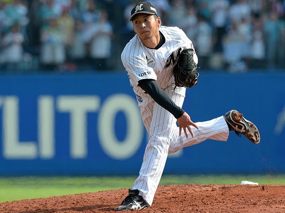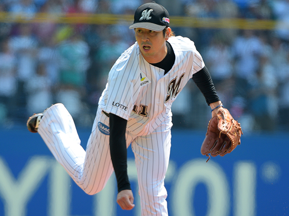6番 ナバーロ 四球 外角のフォークを見送りフォアボールを選ぶ 1,2塁 |