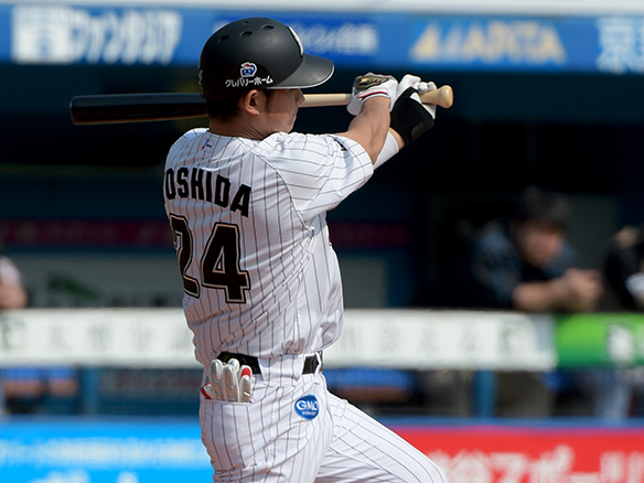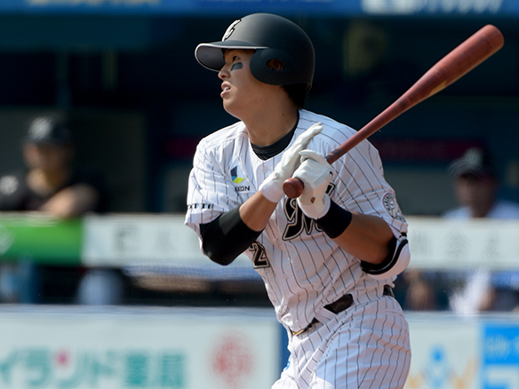 投手 大嶺祐 1番 淺間 左安 レフトへのヒットを放つ 1塁 |