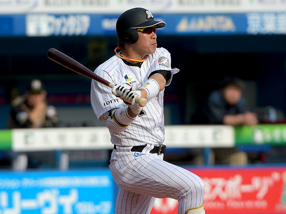 8番 レアード 左安 レフトへのヒットで出塁 1,2塁 |