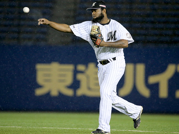 投手 塚原 5番 ナバーロ 投直 外角のスライダーを打つもピッチャーライナー 1アウト |