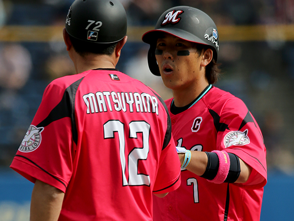 強襲安打で出塁した鈴木は松山コーチとグータッチ