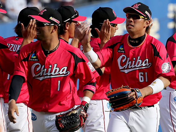 逆転勝利に笑顔でハイタッチするマリーンズナイン