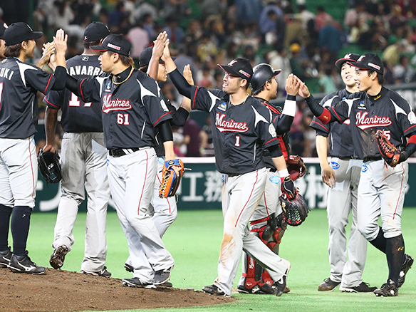僅差の勝利にナインは笑顔でハイタッチをかわす!