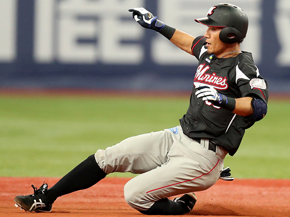 二塁打を放ちセカンドへ滑り込む細谷